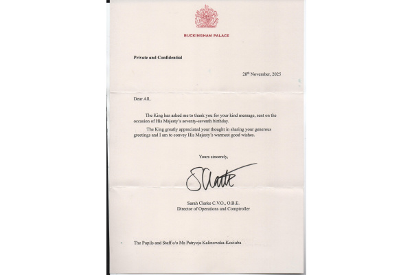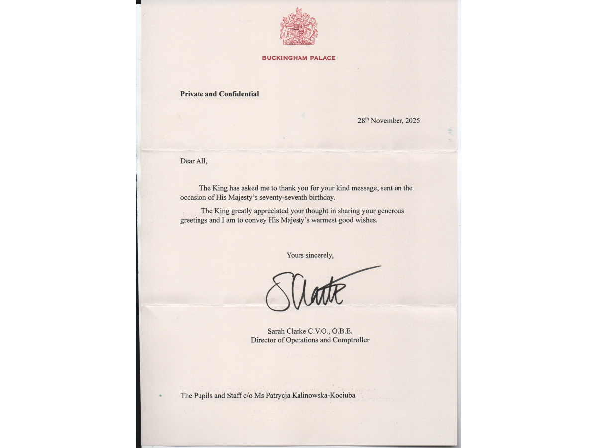 W miesiącu październiku odbył się w naszej szkole konkurs ”Kartka urodzinowa dla Króla Karola III”, w ramach którego uczniowie klas 4–8 przygotowali kartki urodzinowe,pełne ciepłych życzeń z okazji 77 urodzin Jego Królewskiej Mości. Wszystkie wykonane prace zostały wysłane do Londynu, do Króla Karola III. Z dumą informujemy, iż otrzymaliśmy oficjalny list zwrotny prosto z Pałacu Buckingham! W imieniu Króla, Jego personel serdecznie podziękował naszym uczniom za piękne życzenia i pamięć. Czujemy się zaszczyceni. Odpowiedź z Pałacu Buckingham sprawiła nam wszystkim ogromną radość oraz z pewnością będzie motywacją do nauki języka angielskiego i pisania kolejnych listów w przyszłości. To niesamowite doświadczenie stanowi wspaniałe potwierdzenie, że międzynarodowa korespondencja i nauka języka naprawdę łączą!