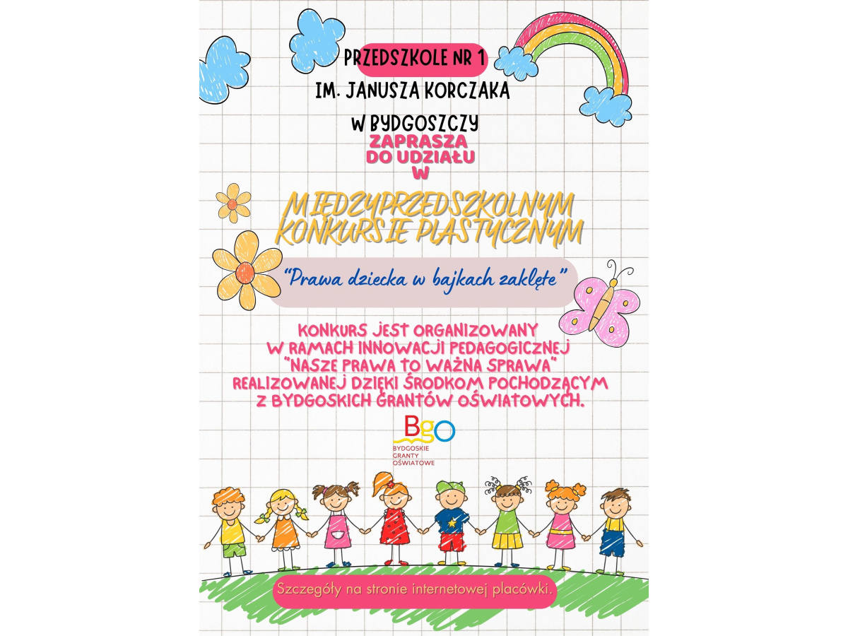 Serdecznie zapraszamy wszystkie dzieci do wzięcia udziału w Międzyprzedszkolnym Konkursie Plastycznym „Prawa dziecka w bajkach zaklęte" organizowanym w ramach innowacji "Nasze prawa to ważna sprawa" finansowanej ze środków pochodzących z Bydgoskich Grantów Oświatowych