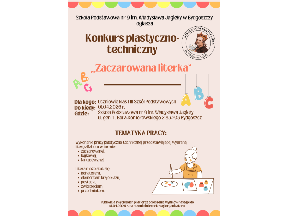 Zachęcamy do udziału w konkursie plastyczno-technicznym ,,Zaczarowana literka" dla uczniów klas I-III, którego celem jest rozwijanie kreatywności oraz zdolności plastycznych. To świetna okazja, aby zaprezentować swoje umiejętności i talenty oraz zdobyć nowe doświadczenia i dobrze się bawić.