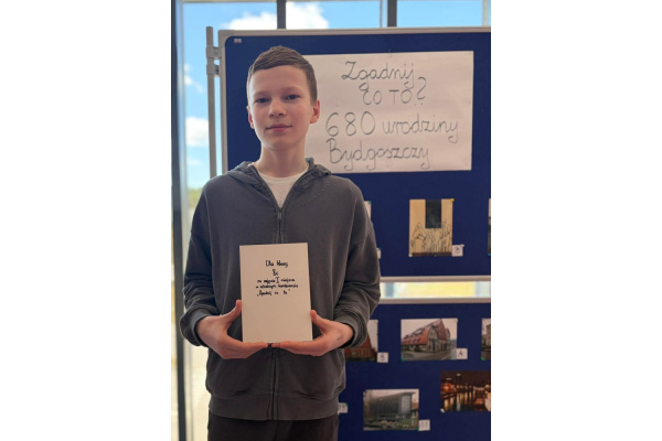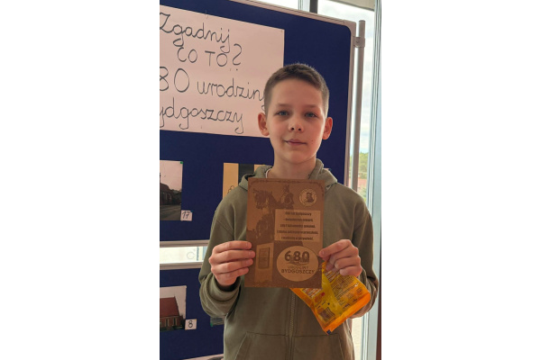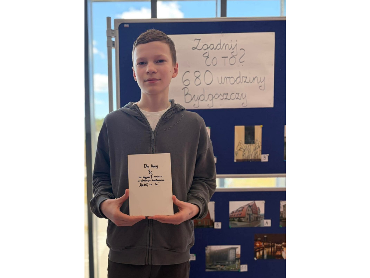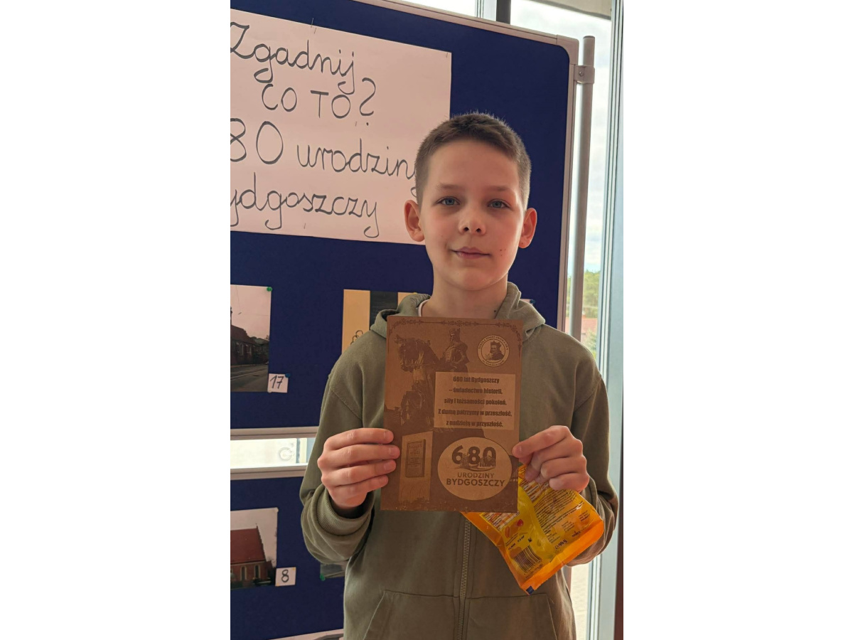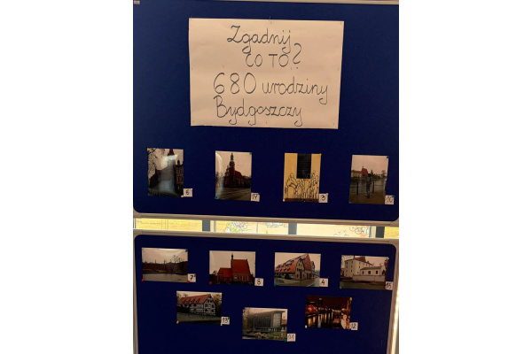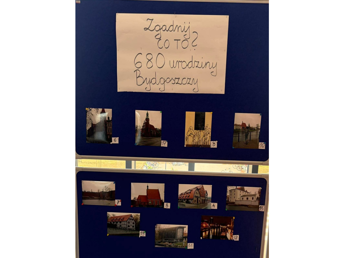 Z okazji 680 urodzin Bydgoszczy zorganizowaliśmy w naszej szkole zabawę „Zgadnij co to”. Reprezentanci poszczególnych klas rozpoznawali ważne miejsca w Bydgoszczy. Zdjęcia z miejscami do rozpoznania wykonali uczniowie w ramach konkursu fotograficznego „Bydgoszcz w obiektywie – 680 lat historii”. Katalog zdjęć został uzupełniony także przez wolontariuszkę z klasy 8c, Kalinę Michlińską. Wszyscy uczestnicy zabawy wykazali się znajomością kluczowych miejsc w Bydgoszczy. Wśród klas z największą znajomością naszego miasta znalazły się klasy 4b, 5b, 6a, 7a, 8c.