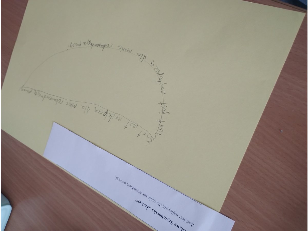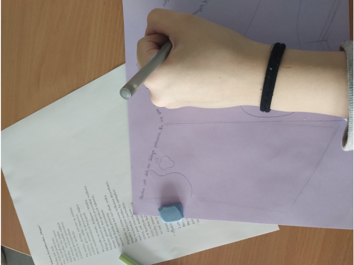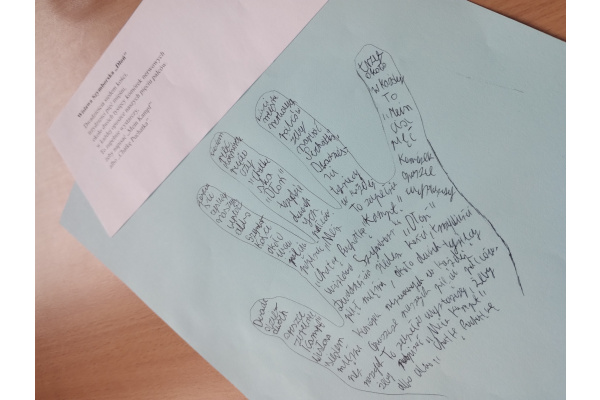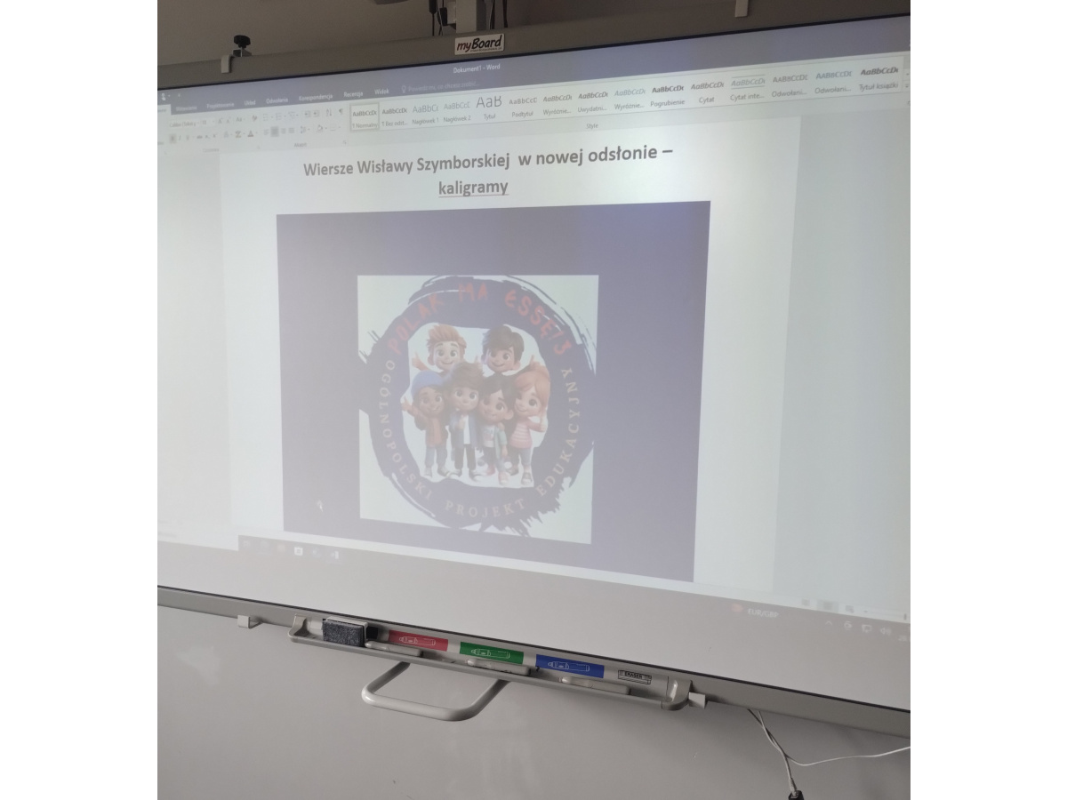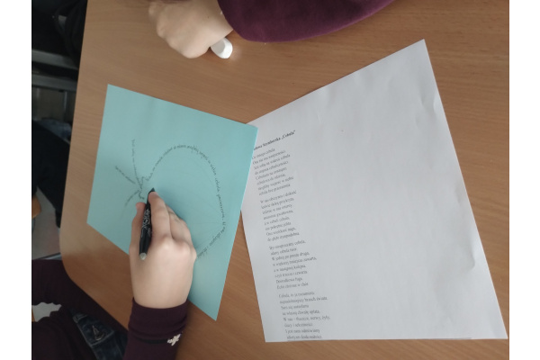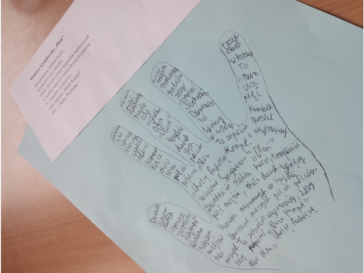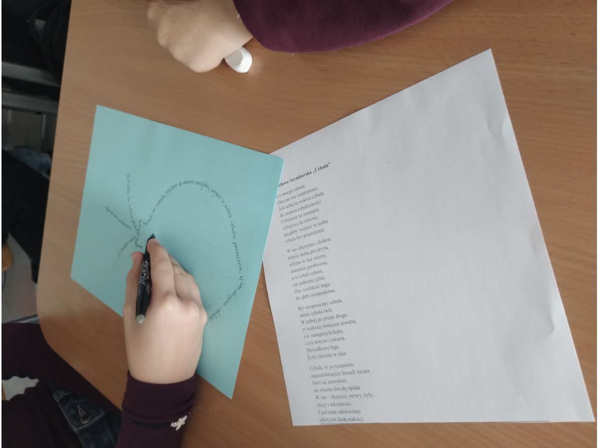 Uczniowie klasy 7b w ramach Ogólnopolskiego projektu „Polak ma essę! 3” wykonali kaligramy (zadanie nr 10). Urzeczeni obrazowością i realnością przedstawionego przez Wisławę Szymborską świata w wierszu „Nic dwa razy” postanowili zmierzyć się z tym kreatywnym zadaniem. Bogactwo środków stylistycznych zastosowanych przez poetkę poniosło uczniów na nieznane wody. Zainspirowani stworzyli poetyckie obrazy do wierszy: „Chmury”, „Kałuża”, „Śmiech”, „Mapa”, „Cebula”, a także „Dłoń”. Powstały prawdziwe cuda!