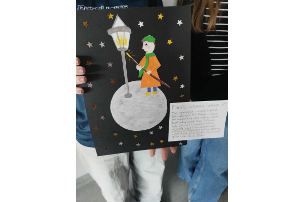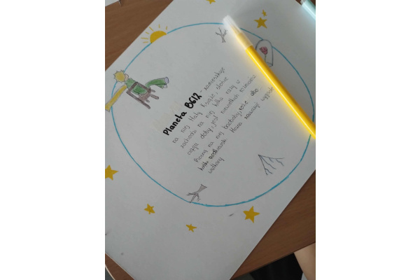 Po cyklu lekcji poświęconych „Małemu Księciu” przyszedł czas na kolejne zadanie w ramach Ogólnopolskiego projektu „Polak ma essę! 3”. Uczniowie klasy 7b ruszyli w podróż śladami tytułowego bohatera. Salę lekcyjną zamienili w pracownię plastyczną i tworzyli. Zanim jednak wpadli w wir pracy, musieli zapoznać się z odpowiednim fragmentem książki, by oddać rzeczywisty obraz planety. Każda z ośmiu grup przygotowała inną asteroidę zamieszkiwaną m.in. przez: Króla, Próżnego, Bankiera czy Geografa. Ostatnim elementem zadania było zaprezentowanie na forum klasy swojej pracy. Wszyscy uczniowie jednogłośnie zgodzili się ze słowami Małego Księcia, że „dorośli są dziwni”.