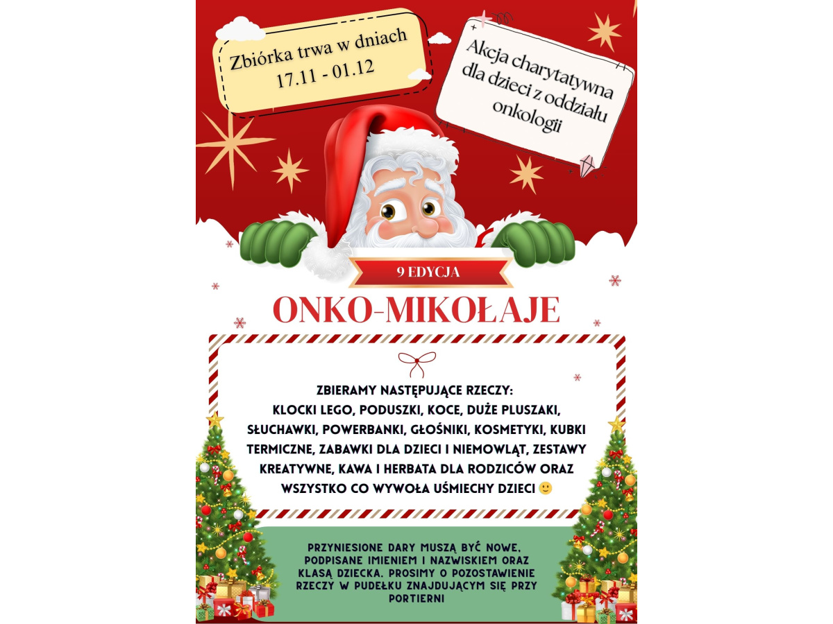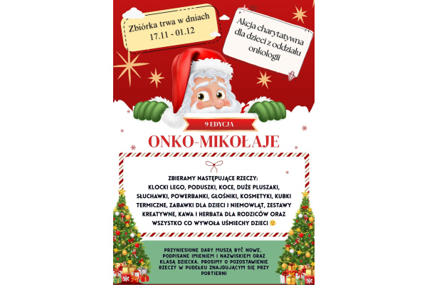 W dniach 17.11. - 01.12. nasza społeczność weźmie udział w 9. edycji akcji charytatywnej „Onko-Mikołaje”, której celem jest przygotowanie świątecznych paczek dla dzieci z oddziałów onkologicznych. To wyjątkowa inicjatywa, która wnosi uśmiech, magię i odrobinę beztroski tam, gdzie toczy się trudna walka o zdrowie.