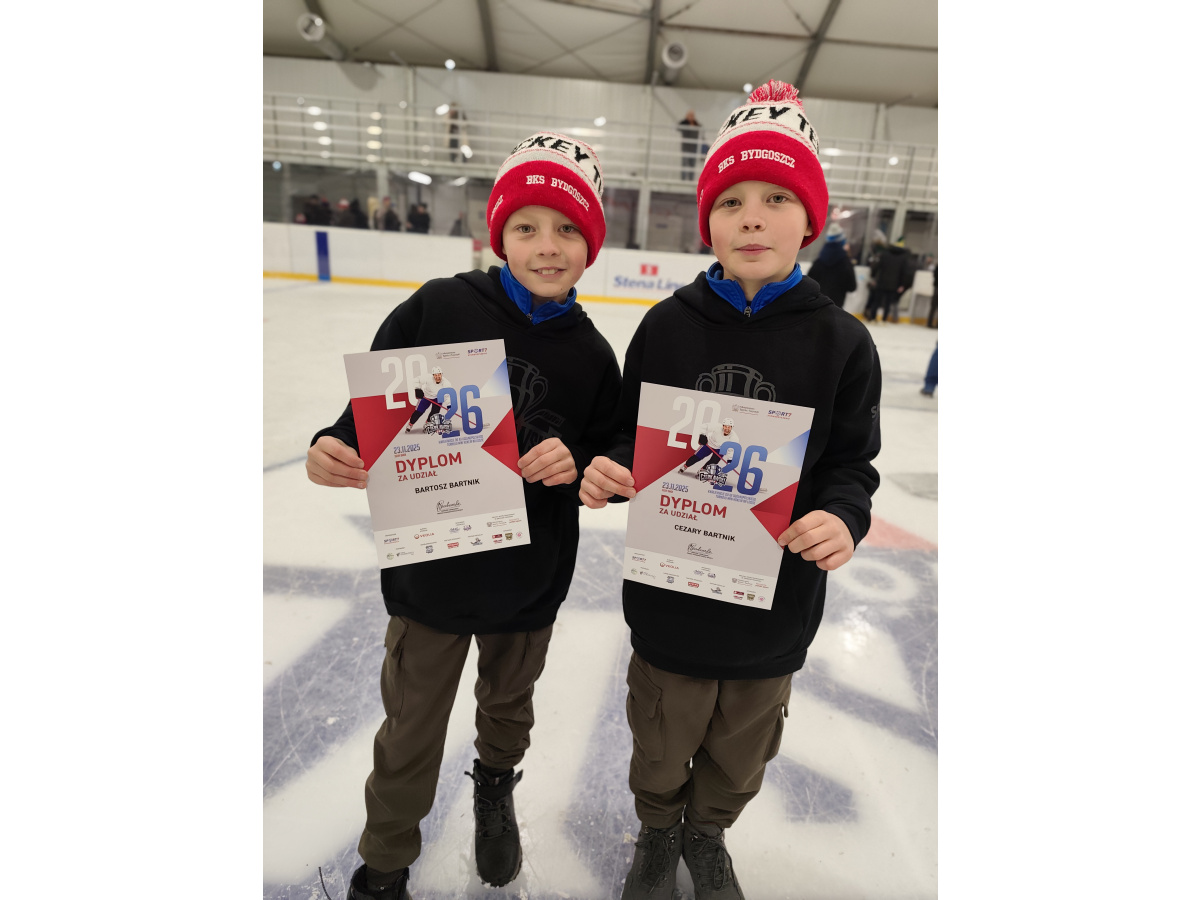 Czarek i Bartek Bartnik uczniowie klasy 3c, swoją przygodę z hokejem na lodzie rozpoczęli w 2022 roku, mając zaledwie 6 lat. Od pierwszych treningów sport ten stał się ich prawdziwą pasją, którą rozwijają na co dzień w Budowlanym Klubie Sportowym BKS Bydgoszcz w sekcji hokeja na lodzie.