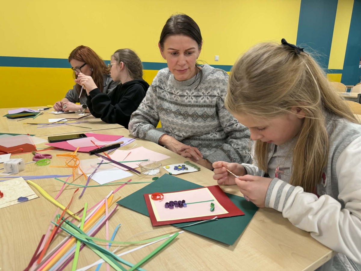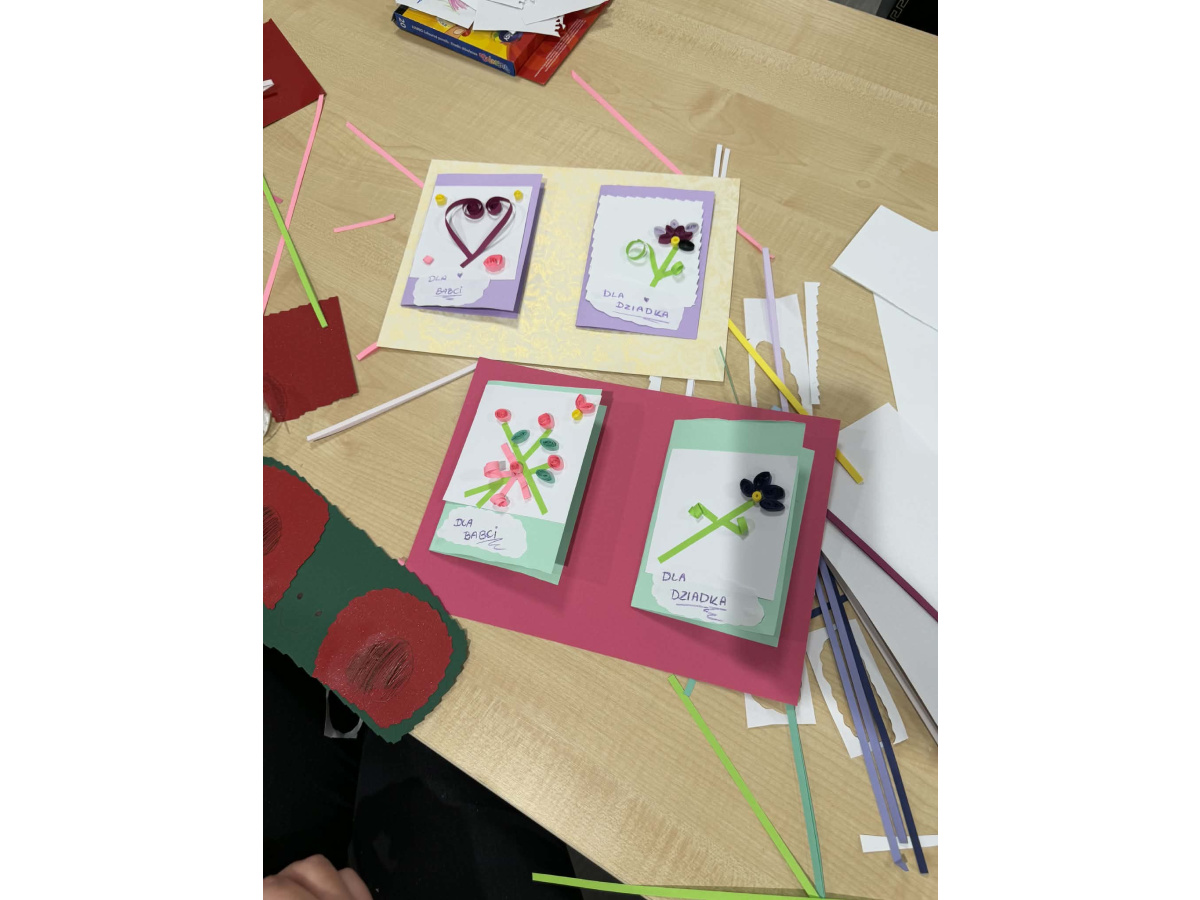 Następnie pani Agata zaprezentowała technikę quillingu, polegającą na tworzeniu ozdób z cienkich, zwijanych pasków papieru. Uczestnicy poznali podstawowe zasady tej metody oraz przykłady jej zastosowania. Po krótkim instruktażu rodziny wspólnie przystąpiły do pracy, wykonując własnoręczne kartki z okazji Dnia Babci i Dnia Dziadka.