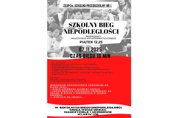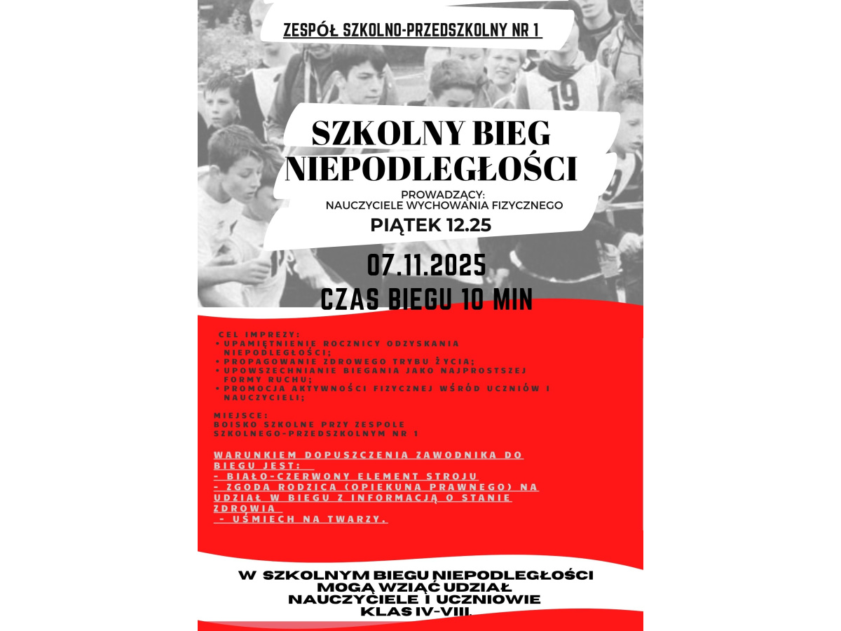 W najbliższy piątek, podczas przerwy obiadowej o godzinie 12:25, odbędzie się w naszej szkole Szkolny Bieg Niepodległości.