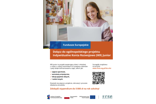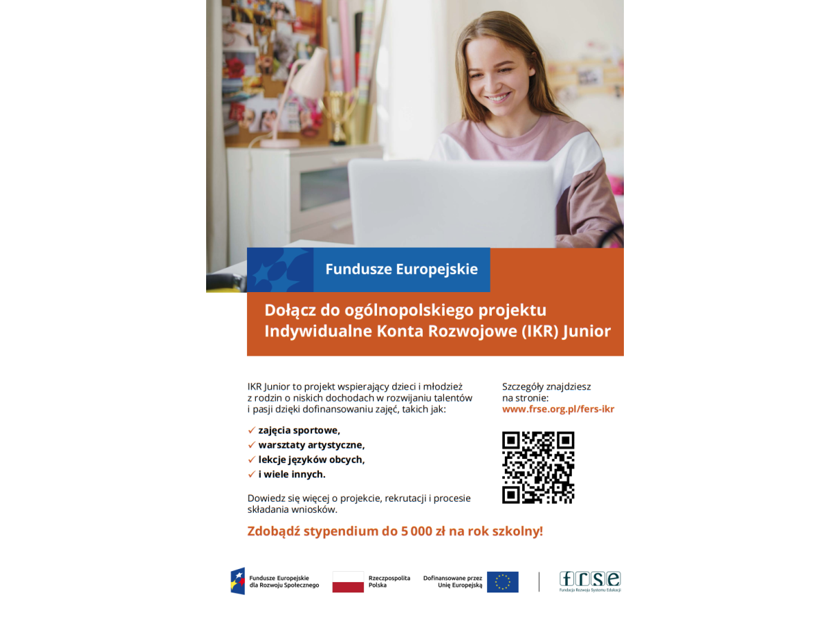 Ministerstwo Edukacji Narodowej informuje, że trwa rekrutacja do projektu Indywidualne Konta Rozwojowe (IKR) Junior. Ta inicjatywa finansowana ze środków europejskich ma na celu wsparcie dzieci i młodzież z rodzin o niskich dochodach oraz tych z pieczy zastępczej. Projekt skierowany jest do uczniów szkół podstawowych (klasy 4-8) oraz szkół ponadpodstawowych.