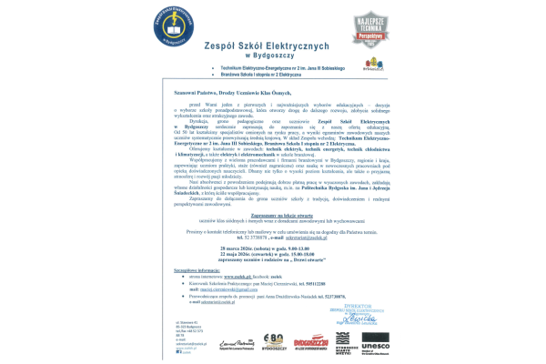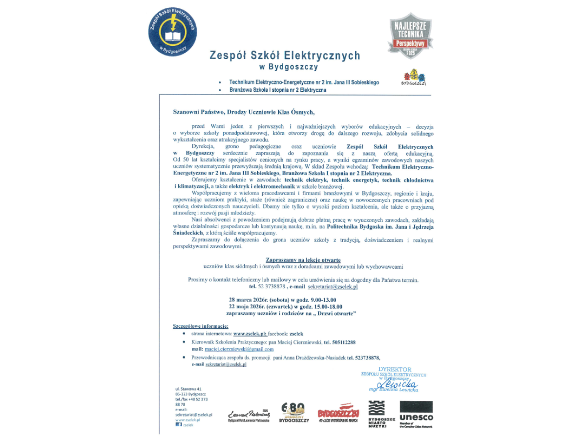 Dyrekcja, grono pedagogiczne oraz uczniowie Zespół Szkół Elektrycznych w Bydgoszczy serdecznie zapraszają do zapoznania się z naszą ofertą edukacyjną. Od 50 lat kształcimy specjalistów cenionych na rynku pracy, a wyniki egzaminów zawodowych naszych uczniów systematycznie przewyższają średnią krajową. W skład Zespołu wchodzą: Technikum Elektryczno-Energetyczne nr 2 im. Jana III Sobieskiego, Branżowa Szkoła I stopnia nr 2 Elektryczna.