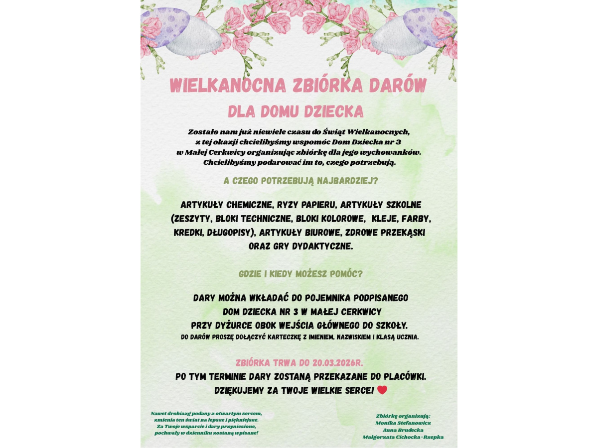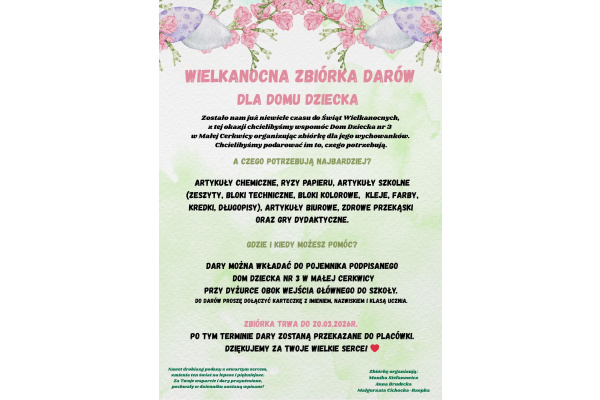 Serdecznie zachęcamy do wsparcia Wielkanocnej Zbiórki Darów dla Domu Dziecka nr 3 w Małej Cerkwicy. Wierzymy, że wspólnymi siłami uda nam się realnie wesprzeć tych, którzy tego najbardziej potrzebują. Zbiórka trwa od 09.03.2026 do 20.03.2026 Przyniesione rzeczy proszę podpisywać imieniem, nazwiskiem i klasą darczyńcy (wówczas wpiszemy pochwałę do dziennika) oraz włożyć do pojemnika podpisanego “Zbiórka darów dla DOMU DZIECKA”. Lista potrzebnych rzeczy na plakacie. Dziękujemy za KAŻDY, nawet drobny dar!