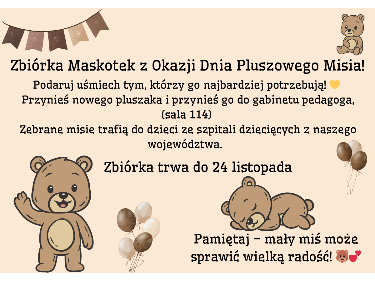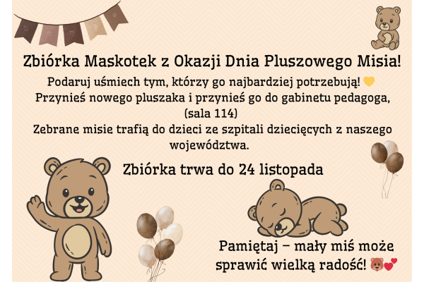 Z okazji Dnia Pluszowego Misia nasza szkoła organizuje zbiórkę nowych pluszaków dla dzieci przebywających w szpitalach dziecięcych w naszym województwie.